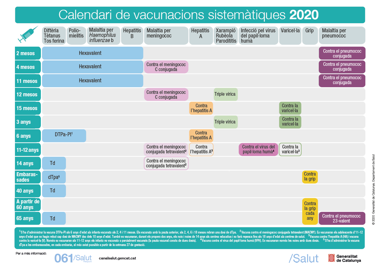 El calendario de vacunaciones de 2020 en Cataluña protege contra 15 enfermedades mediante 13 vacunas recomendadas y gratuitas. Hay algunas como las del Rotavirus Y la del Meningococo B, que no están incluidas, pero que están extendidamente recomendadas puesto su potencial gravedad.